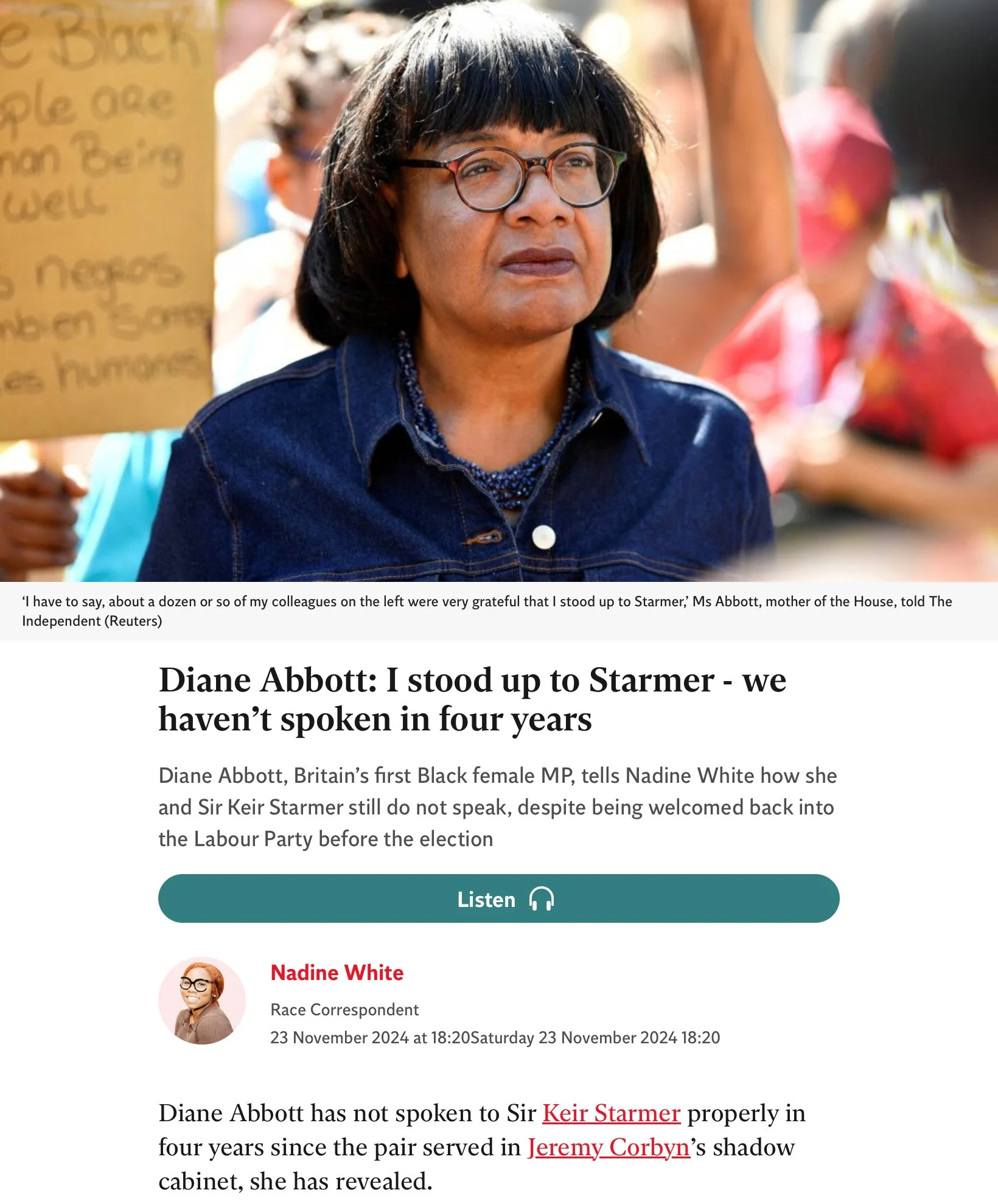 Diane Abbott: I stood up to Keir Starmer - and we haven’t spoken in four years - The Independent - 23/11/2024
